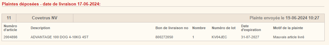 Vous ne trouvez pas la date de livraison du produit que vous souhaitez retourner ou pour lequel vous souhaitez signaler une plainte ? Aucun problème. Envoyez un courriel à order@covetrus.be et nous nous en occuperons.